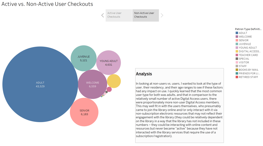 In looking at non-users vs. users, I wanted to look at the type of user, their residency, and their age ranges to see if these factors had any impact on use. I quickly learned that the most common user type for both was adults, and that in comparison to the relatively small number of active Digital Access users, there were proportionately more non-user Digital Access members. This may well fit in with the users themselves, who presumably came to join the library online and/or only interact with it via non-subscription electronic resources that may not reflect their engagement with the library (they could be relatively dependent on the library in a way that the library has not included in these numbers – they could be interacting with online content and resources but never became “active” because they have not interacted with the library services that require the use of a subscription/registration).