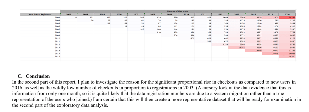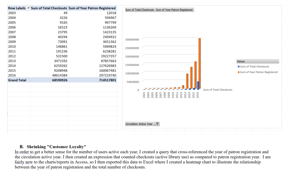 Before diving too deeply into the data, I wanted to examine things from a broad perspective. Using Excel pivot tables, I created the following visualizations regarding checkouts, patron registration year, and the correspondence between these two entities.